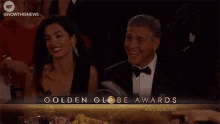 George Clooney and Amal Clooney at the Golden Globe Awards, with George showing a quick, possibly fake, smile.