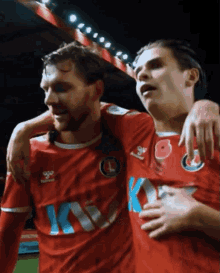 Footballers George Dobson and Alex Gilbey celebrate on the field, clapping to fans after a match.
