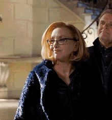 Gerri Kellman (J. Smith Cameron) from Succession, wearing glasses and a dark textured jacket, standing next to a man.