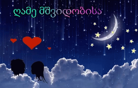 A beautiful Georgian good night greeting card with a crescent moon, twinkling stars, and romantic silhouettes.
