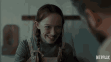 Amybeth McNulty as Anne Shirley Cuthbert shares a joyful giggle in a scene from Netflix's Anne With An E.