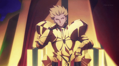 Gilgamesh from Fate, adorned in golden armor, sits on his throne with an annoyed expression.
