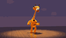 A cartoon giraffe performs a lively dance on a wooden stage, moving its head and body to an unseen rhythm.