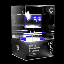 A collectible 'Glitchy BlockOwls in Chains' display box featuring a dynamic, glitching owl figure.