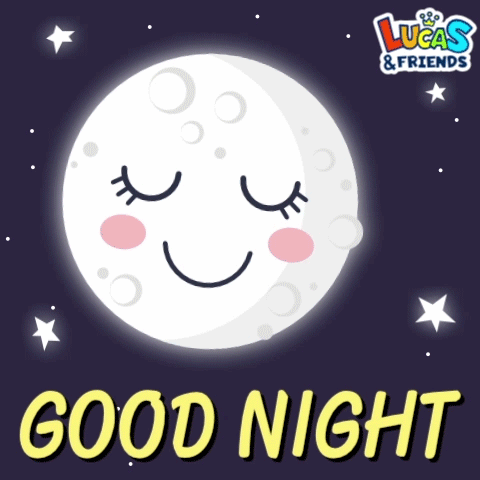 A cute animated moon from Lucas & Friends wishes everyone a good night under a starry sky.