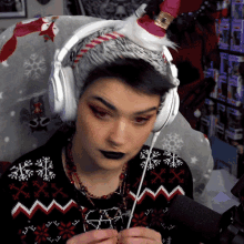 Ghoulbagel reacts with 'God Damn' while wearing a festive hat and headphones.