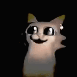 An animated cat-like creature with large eyes reacts as Goku appears and disappears in the background.