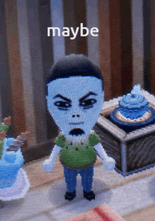 Golden Kamuy's Tsukishima appears as a pixelated Mii-like character, expressing uncertainty with the word 'maybe'.