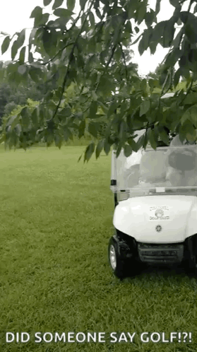 Justin skillfully slides a golf cart across a lush green golf course, exclaiming 'DID SOMEONE SAY GOLF!?!'