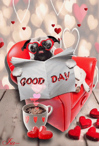 A cute pug dog wearing heart glasses reads a 'Good Day' newspaper while enjoying coffee.