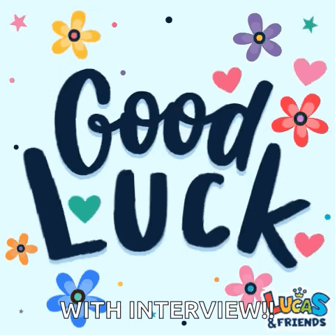 A colorful animated greeting card wishing 'Good Luck With Interview!' from Lucas & Friends.
