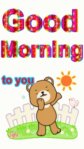 A cheerful animated greeting with a cute bear, a bird, and the text 'Good Morning to you'.