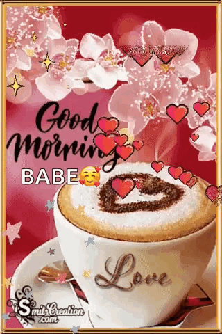 A delightful cup of coffee adorned with hearts and flowers, featuring a 'good morning babe' message on the saucer.