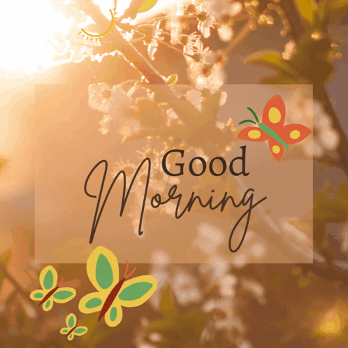 A vibrant good morning image with bright sun, delicate blossoms, and colorful butterflies.