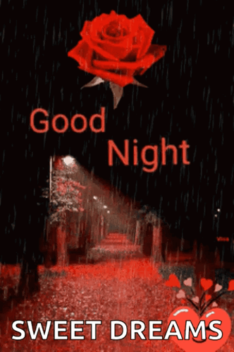 A beautiful good night message with a red rose, set against a rainy, dark path, wishing sweet dreams.