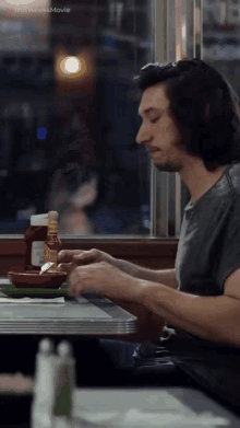 A man sits alone in a diner booth, looking out the window with condiments on the table.