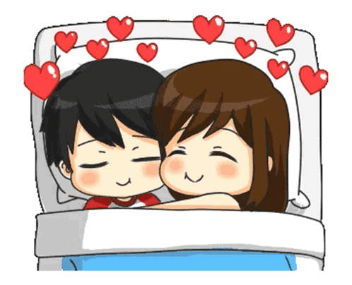Cute cartoon couple cuddling in bed with hearts, sharing a sweet goodnight moment.