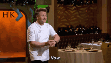 Gordon Ramsay, in a chef's uniform, emphatically says 'Now' in a festive restaurant setting.