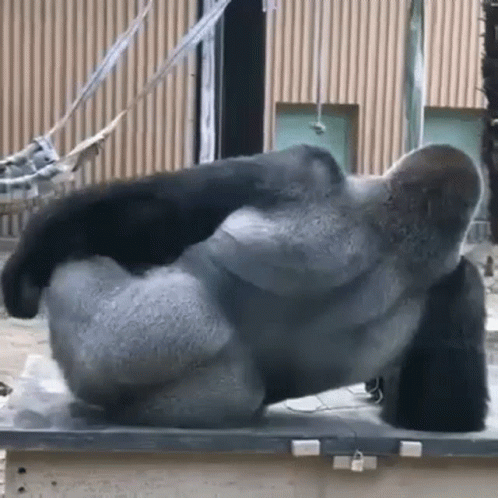 A gorilla is seen scratching its butt while lying on a wooden ledge in its enclosure.