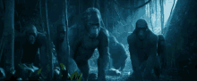 A group of gorillas in a dark, mysterious jungle, looking intense and seemingly unhappy.