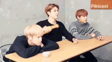 Got7 members Jackson, JB, and Mark at a desk, with Bambam hilariously eating chicken.
