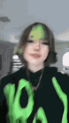 A goth girl with green hair and a black man share a kiss, featuring alternative style and neon green accents.