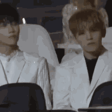 Gowon from Loona and Jeonghan from Seventeen are seen reacting at a K-pop event.