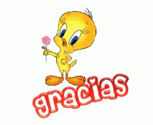 Tweety Bird holds a pink flower, expressing gratitude with the word "gracias" displayed below.