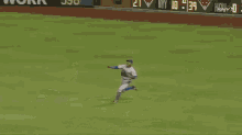 A baseball player slides on the field in an attempt to catch a ball, while another player, Murphy, runs past.