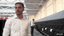 Grealish smiles while standing in a white shirt in an empty stadium setting.