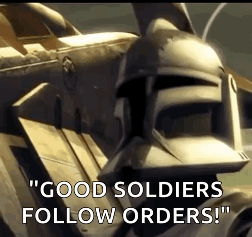 Commander Gree's helmet with the quote 'Good Soldiers Follow Orders!' from Star Wars: The Clone Wars.