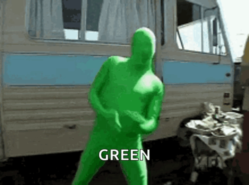 A person in a full green suit, known as the Green Man, dances energetically in front of a trailer.