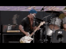 Green Day performing live at Woodstock 94, featuring Tre Cool on drums and Billie Joe Armstrong on guitar.