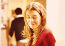 Meredith Grey (Ellen Pompeo) in a red sweater smiles with eyes closed, a man walks behind her.