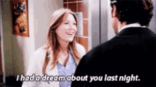 Meredith Grey from Grey's Anatomy tells someone, "I had a dream about you last night," with a smile.