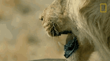 Close-up of a growling lion from National Geographic's Savage Kingdom, showing its teeth and tongue.