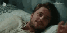 Selin from Gunesin Kizlari smiles and makes a peace sign while lying in bed.