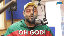 Badshah reacts with 'OH GOD!' while speaking into a microphone at Radio City India, wearing a colorful tracksuit.