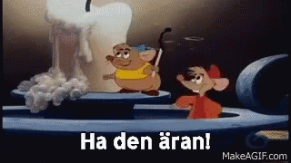 Jaq and Gus from Cinderella celebrate with a 'Ha den äran!' birthday greeting next to a candle.