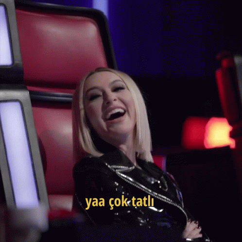 Hadise laughing joyfully in a black leather jacket, with the Turkish caption 'yaa çok tatlı' (oh, so cute).