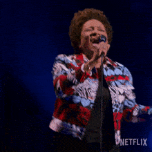 Wanda Sykes delivers a hilarious stand-up performance on stage, holding a microphone and wearing a colorful jacket.
