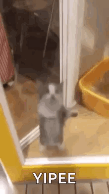 An adorable cat stands on its hind legs, looking out a glass door with an overlayed 'YIPEE' caption.