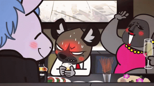 Gori laughs heartily while Haida looks flustered, with Tadano smiling beside them at the bar.