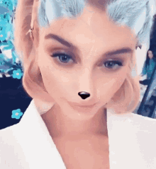 Hailey Baldwin poses with a cute cat ears and nose Snapchat filter, smiling and making a kissing face.