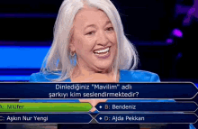 Hamide Tanır reacts with joy and laughter after answering a question correctly on a game show.