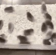 A group of hamsters and gerbils quickly gather and swarm around a pile of food in their enclosure.