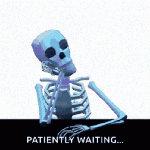 An animated skeleton sits at a table, looking bored and patiently waiting for something.