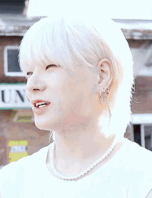 Hanse Dohanse of Victon with striking white hair, wearing a pearl necklace and lip piercing, looking directly at the camera.