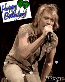 A man sings into a microphone with "Happy Birthday!" text and balloons in the background.