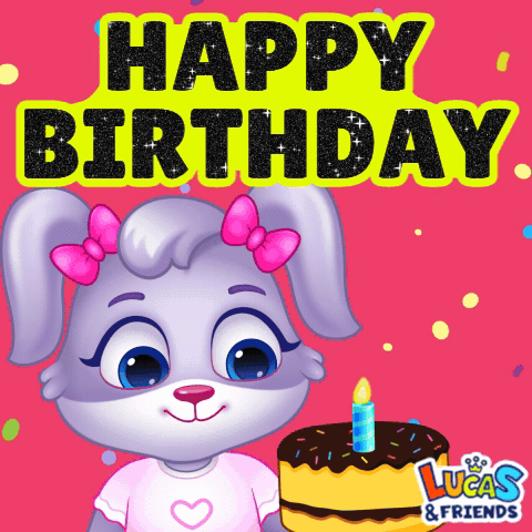 An animated Lucas & Friends bunny character holding a birthday cake with a lit candle, celebrating a happy birthday.